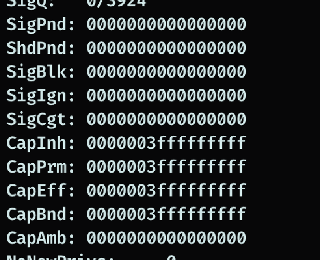 Проверяем capabilities — они максимальные, контейнер привилегированный, значит побег на хост несложный.