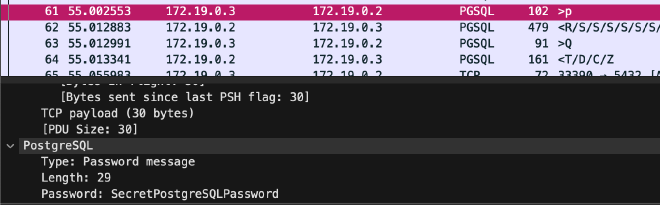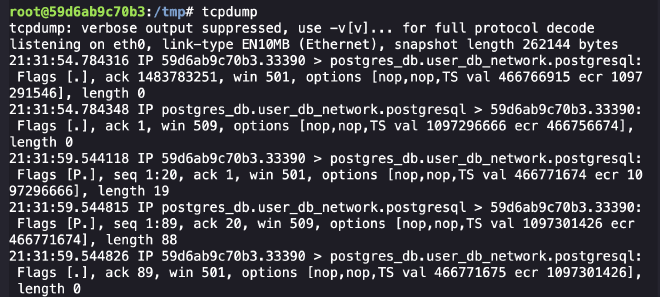 По условию нужно сделать lateral move между контейнерами и затем сбежать на хост. На этапе разведки, прослушивая трафик, детектим взаимодействие с PostgreSQL — это соседний контейнер.