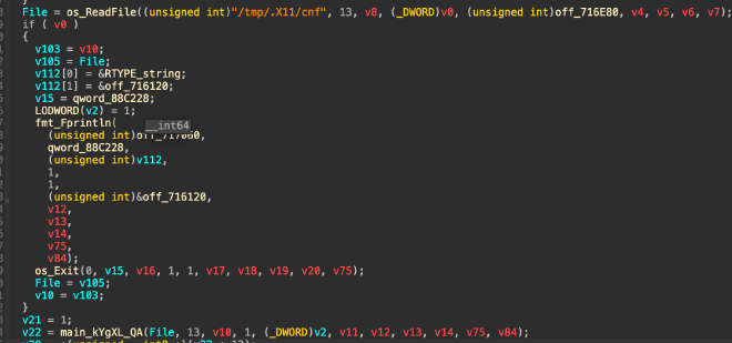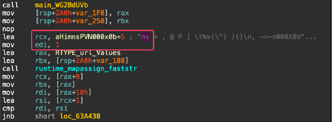 Дальше функция main.qvHPoPlV собирает URL, делает http.Client.Get, читает тело и дешифрует AES‑CBC с ключом enc_key (hex). Внутри видно параметры запроса. По runtime_mapassign_faststr вытаскиваем ключи: n и s. Значения — hostname (uname -n) и счетчик.